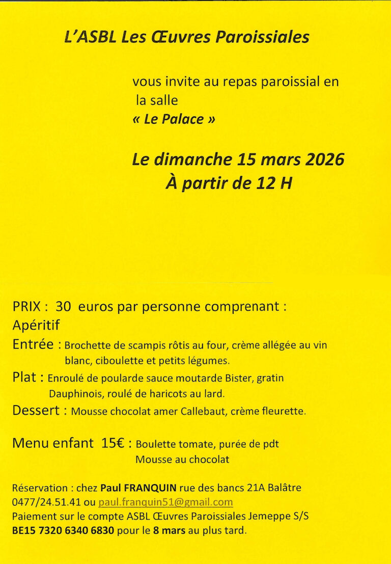 Evenements Dîner Paroissial 2026 26 janvier 202626 janvier 2026 Evenements Le dimanche 15 mars 2026 en la salle « Le Palace »