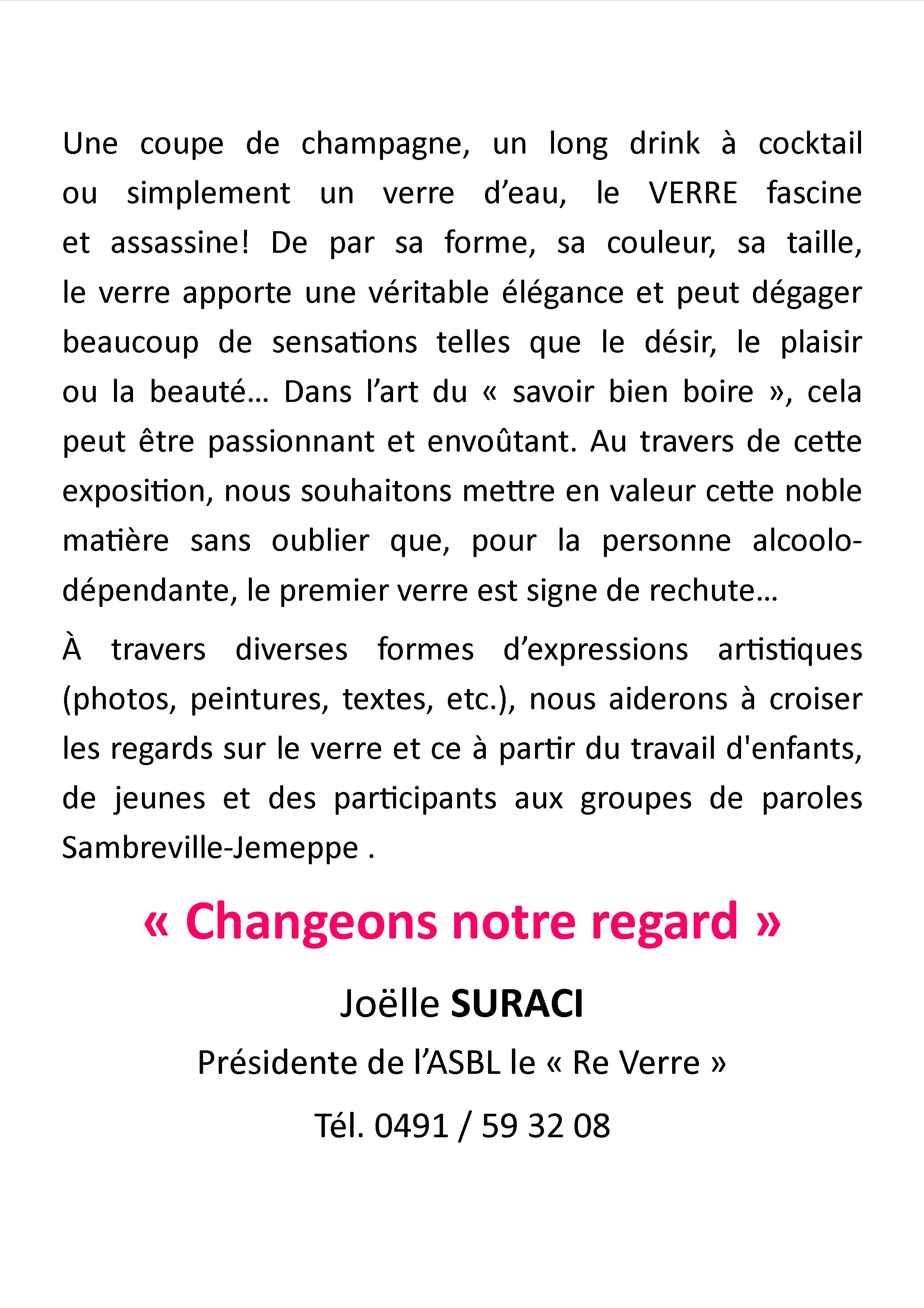 Le Re Verre est un groupe de parole accueillant des personnes touchées par le problème de l’alcool : personnes alcooliques, conjoints, amis, sympathisants. Ces groupes se réunissent une fois par semaine.