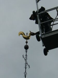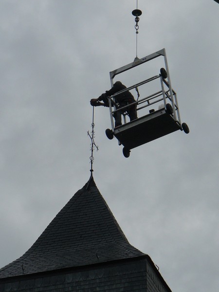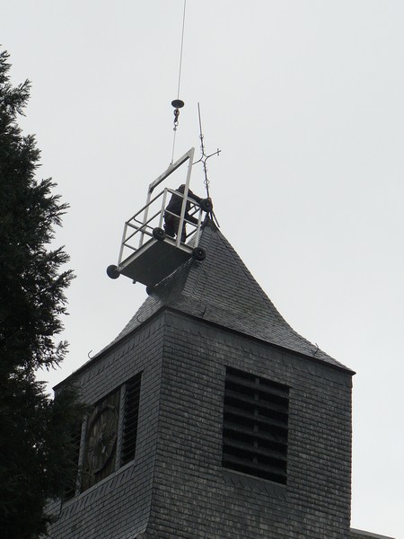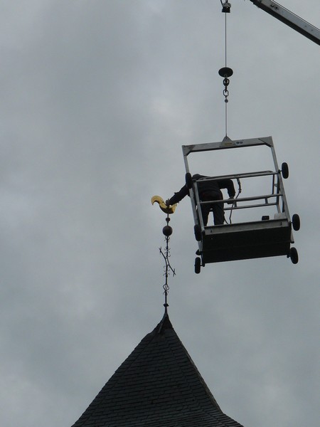Un nouveau coq Un nouveau coq est venu nicher sur le clocher de l’église d’Onoz le merdi 15 décembre 2015.L’ancien coq était tombé lors d’une tempête. Il était trop abîmé pour être restauré : un nouveau tout brillant le remplace donc. L'ancien coq et le nouveau... : Placement de la croix et de la boule : Placement du coq :